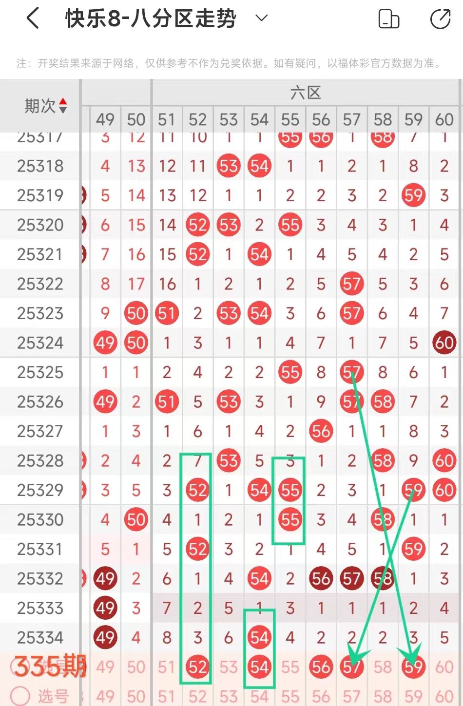 上期六区开出54这1个号码,本期应该出2个。