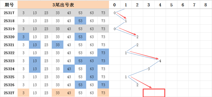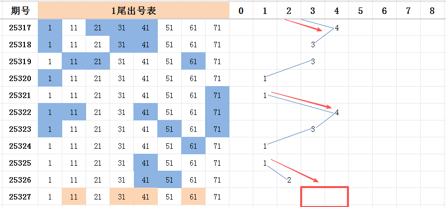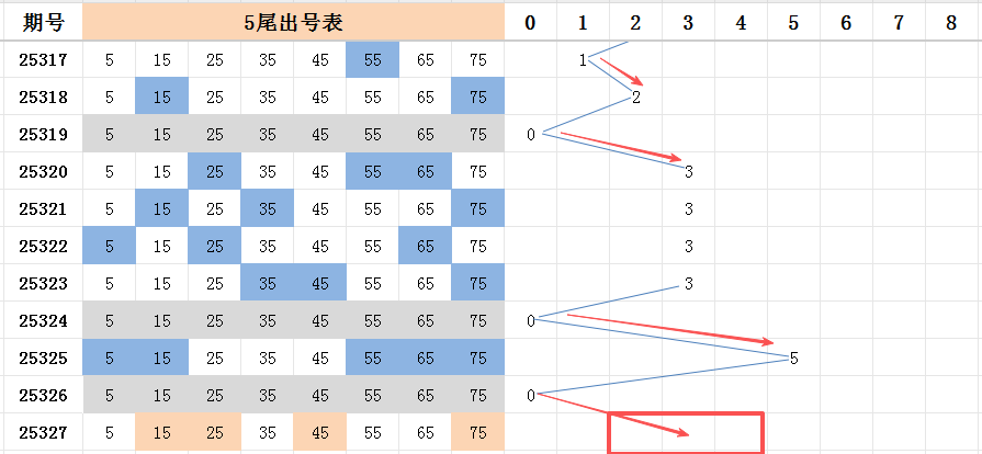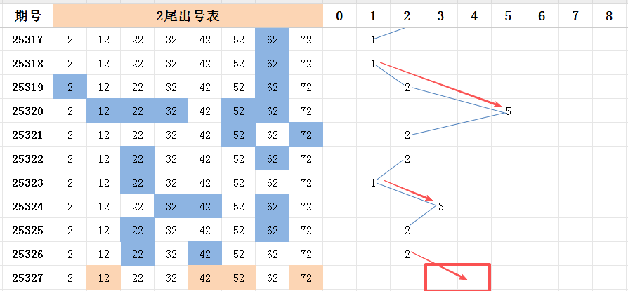 本期看好号码开出的范围是两码走势至四码走势之间。上期7尾再次开出了多码走势,开出了六码。这个确实没有想到,七尾是近期最热的尾号了,300期之后开出了三次多码走势。本期看好的五个尾号是1.2.3.5.0尾。大部分都是热尾。