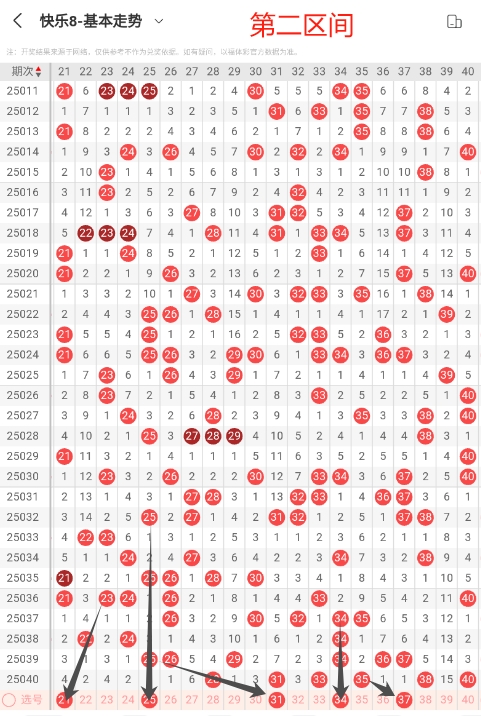 第二:需要重点本区间奇数偶数搭配的号码,需要重点关注21 25 31 34 37这些号码会出现5-7个。