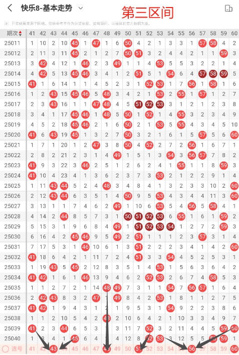 第三:45-60这个小区间需要重点关注会出现多个号码,防范等间距遗漏的号码,关注冷号会开出,重点关注区间联动号码。