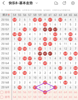 60码,遗漏间隔为1.3.1,形态为ABA,且如上图所示,与往期奖号58 62码形成一个菱形,所以看好。