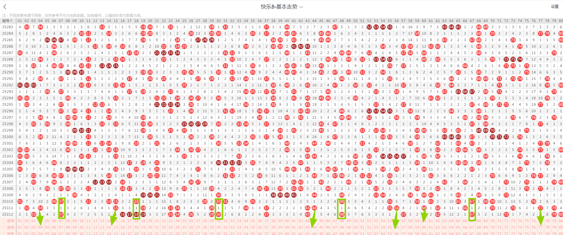 从这张走势图可以看到我画标出来了遗漏示意号码,开出了隔期(遗漏一期的)5个号码(绿色方块标示的),数量与上期一致,从近期走势图看隔期码回温态势形成,本期判断热度反弹,落号6个号码概率较大(绿色箭头标示的04、15、44、56、60、77)需要关注,有下号概率;