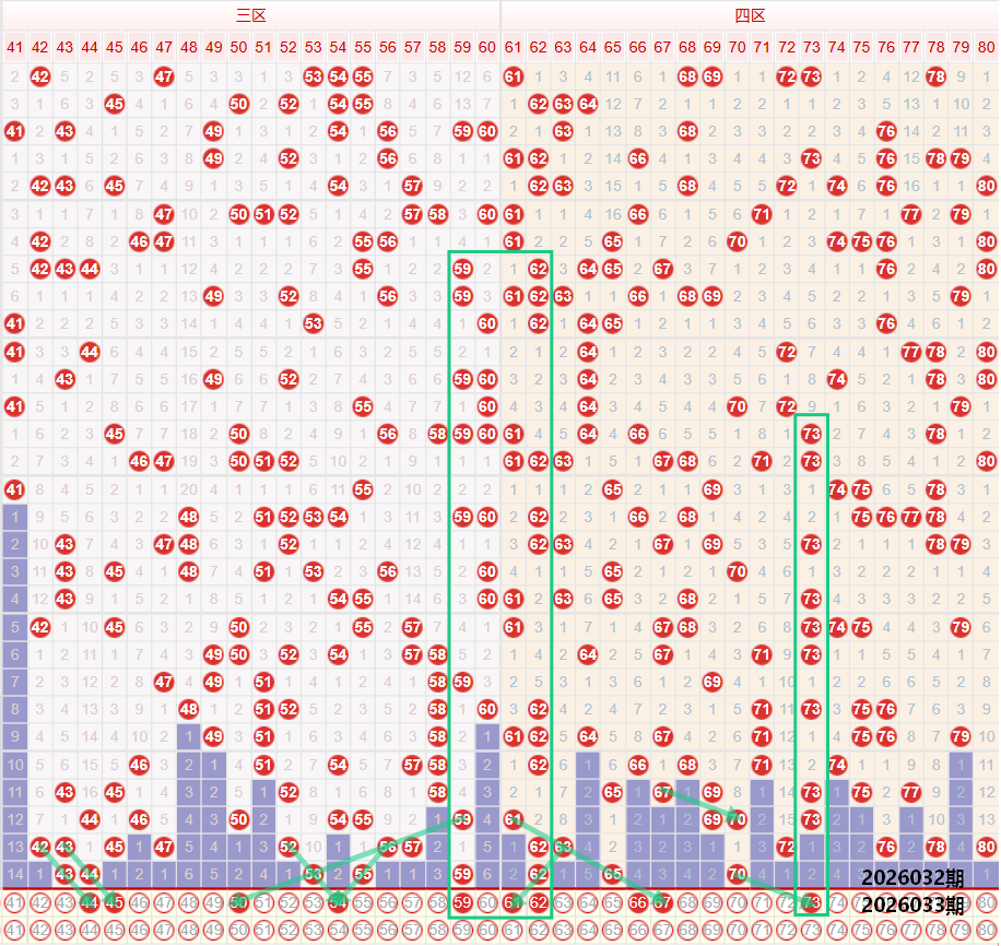 如图所示:在本期大数区的选号中注意在上期的走势中三区间开出了5枚中奖号码,继续保持着均值水平走势,区间依旧保持着连号走势,以及区间同尾的走势,本期要注意三区间的走势很大概率会继续保持均值或者是均值以上的走势,在4字头的位置保持着多期的连续走势,本期注意44 45的同步二连走势,保持第三期的走势,5字头号码,在上期开出了53 55的奇数二连走势,保持着同步向内收缩的走势,本期注意54的夹号走势,以及在上期开出55 59之后,本期注意55 59的重号走势,四区间上期开出了3枚中奖号码,出现了断7字头的走势,6字头开出了62的重号走势,本期要注意62的重号第三期走势,以及61 62的二连走势,在上期开出65的位置注意向后延续66的边号走势,以及66 67的二连走势,后段位置上期断7字头走势,本期注意衔接70的走势,重点关注73的同路延续走势。