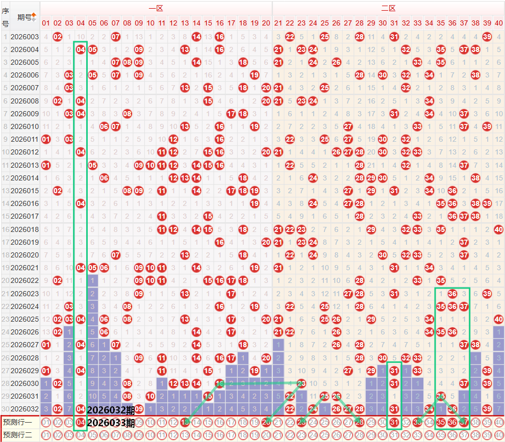 如图所示:在本期小数区的选号中,注意在上期的走势中一区间开出了3枚中奖号码,继续保持在区间的最低位走势,上期的二区间出现了爆单区的走势,小数区共开出了12枚中奖号码,目前的一区间走势保持着持续走冷的形态,因此本期要注意一区间的落号数量继续保持着低位走势,在上期开出02 04的位置,注意04的重号走势,后段位置要注意在上期出现断1字头的走势之后,本期注意13 20的同形态走势,二区间上期开出了高达9枚中奖号码,开出了多组全形态走势,同时保持着多个斜线第三期的走势,本期注意23 28 33 37 27的第三期的走势,可以考虑同时开出多码的走势,重点关注23的夹号走势,以及28 31 34的同路三码走势出现重号走势,另外在上期开出36的位置下方注意连号走势。