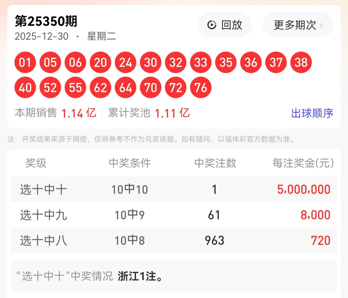 上期福彩快乐8第 2025350期开奖号码为【01 05 06 20 24 30 32 33 35 36 37 38 40 52 55 62 64 70 72 76】,其中大小比7:13,奇偶比为6:14,和值为788,跨度75,四区间比为4:9:2:5。下面是对本期对于每个号码的详细分析。