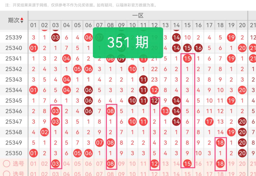 上期第一区间开奖4个号码,本期可能会增加开出。03为小码奇数,与上期01、05形成小码奇数的合理衔接,避免小码奇数断档;08是中码偶数,上期一区偶数仅有06、20,补充中间段偶数可让出号更均衡;12、18均为偶数,分别覆盖11-15、16-20区间,完善偶数的分布层次;15作为中码奇数,恰好填补上期11-15区间的空缺,同时让一区奇偶比例达到3:2,奇偶均衡规律号码间隔适中,无过度密集或稀疏。