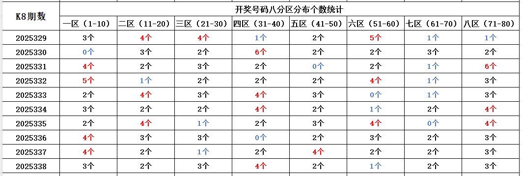 首先看上期回顾,“快乐8”第25338期开奖结果:2.3.9.11.14.25.28.29.34.36.38.39.49.50.58.68.69.71.77.78通过分析开奖号码,分享第一个数据分析:统计开奖号码的八分区冷热走势,判断出号规律。以近10期开奖号码的八分区统计数据为例: