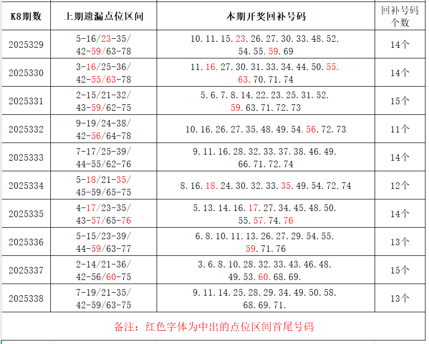 如图,上期的遗漏号码在下期开出10个左右,即为回补号码。定准点位区间首尾号码是关键!以上期2025338期为例,定位4个遗漏区间,围中13码!结合上期开奖号码,以跨度值大于或等于7为依据,本期关注3个遗漏区间:14-25/39-49/58-68;重点关注遗漏区间:4-16/25-38/44-59/66-78,区间遗漏号码可能在本期回补开出。注意区分遗漏区间回补号码和大底号码,不要混淆。个人分析,仅供参考。