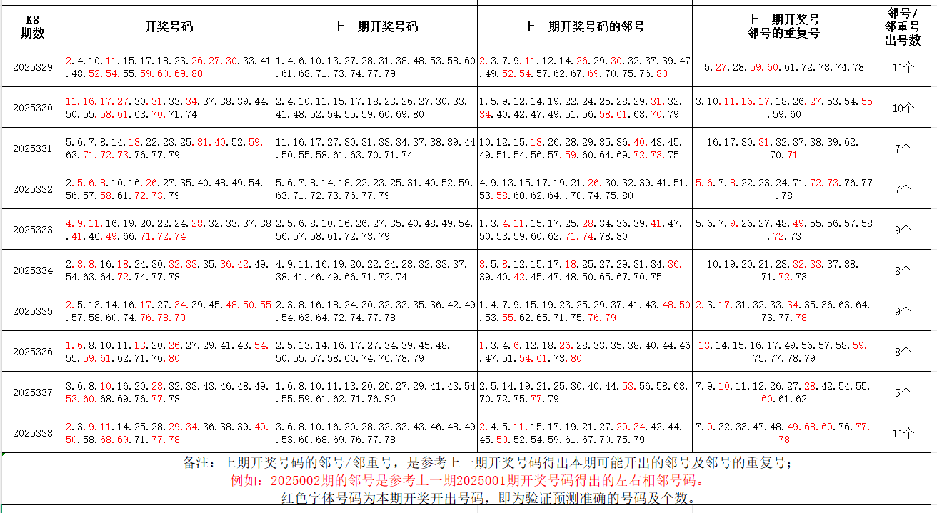 如图,红色字体是上期邻号、邻重号在下期开出,每期开出10个左右。上期邻号开出5个,邻重号开出6个本期参考邻号:1.4.8.12.13.15.24.26.27.30.33.40.48.51.57.59.67.72.76.79;邻重号:2.3.10.28.29.35.37.38.39.49.50.68.69.70.77.78个人分析,仅供参考。