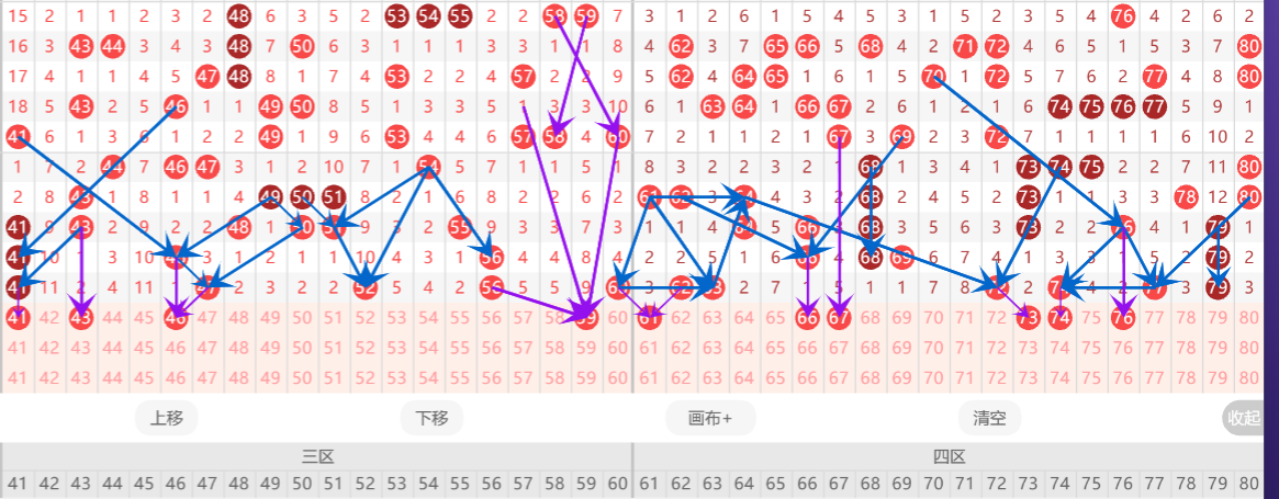 上一期第三区间开出:41/47/52/56/60这五个号码,那么本期对于区间我们如何进行号码的选择呢?选择号码的重点方向在哪里?我有以下几点判断。