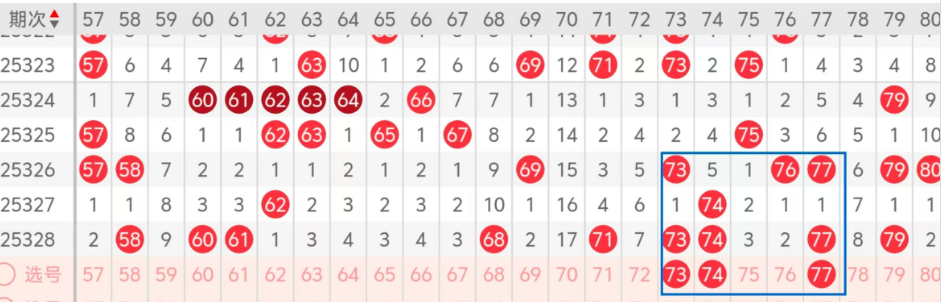 第四区间的走势分析:第四区间上期开出了七个号码球,主要的落号点位在四区间的后半区,走出了五奇两偶的形态走势,上期四区间的前半区落下了两个号码球,后半区落下了五个号码球,整个四区间处于走热的趋势,根据四区间的走势规律,今天的四区间我们主看后半区热码的回补,主看73 74 77这三个号码球的重码落位,73 77走出了对称的走势形态,74走出了三重码的走势形态,这三几个号码球落下两码的机会很大,建议大家打个三胆拖或者三码复二,参考为主!