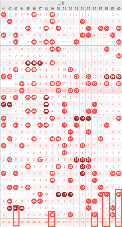 三区:最近三区10期出号情况为:1 5 5 7 2 5 7 5 5 4,总出号情况为44个,平均出号4.4个,本期三区号码走势推荐:43 49 56 58 60,重点关注:43 56 60 。