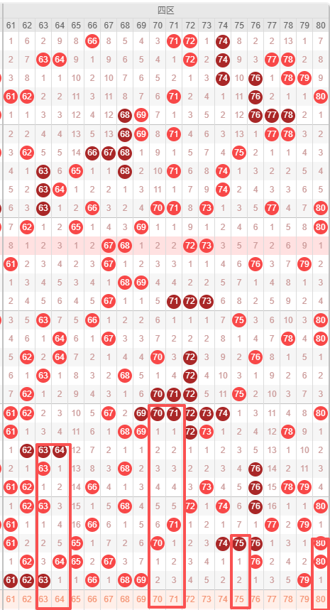 四区:最近四区10期出号情况为:10 6 3 3 7 7 5 7 6 7,总出号情况为61个,平均出号6.1个,本期四区号码推荐:63 64 70 71 75 80,重点关注:64 70 75 80。
