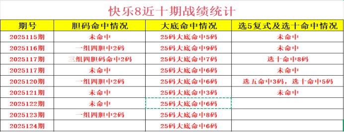 快乐8第2025125期走势及分析,大底命中6码,内含四胆、选五复式及大底