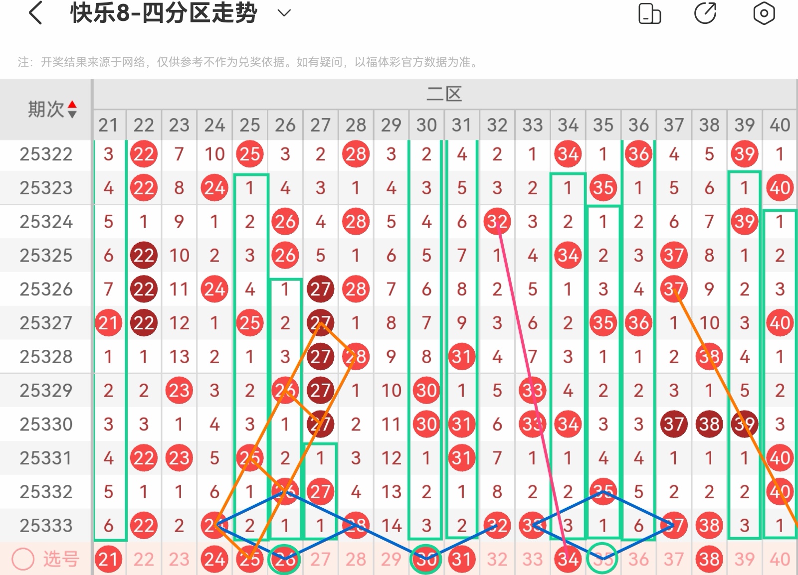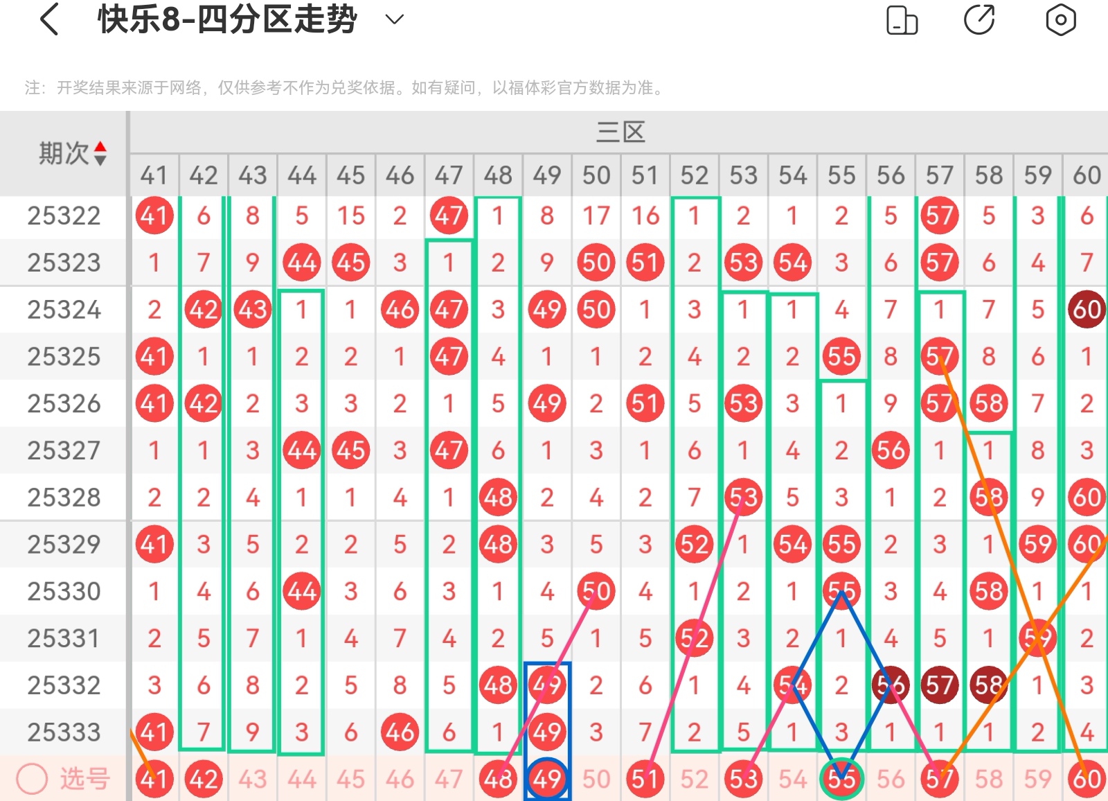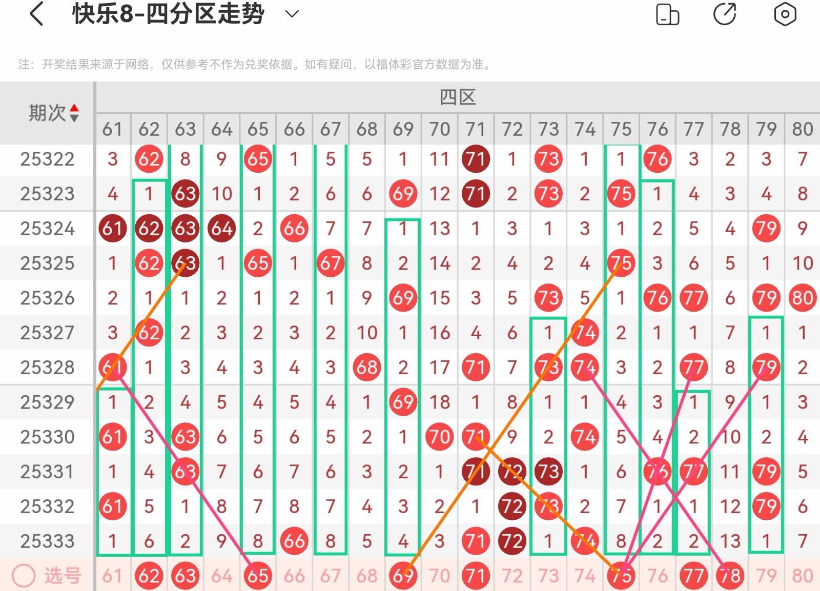 大家好,我是甜丝丝的坏事,主要以快乐八的形态走势、空位走势、遗漏走势以及斜连走势相结合的方法,用公认的四分区走势来进行预测分析,希望能让你有所收获。