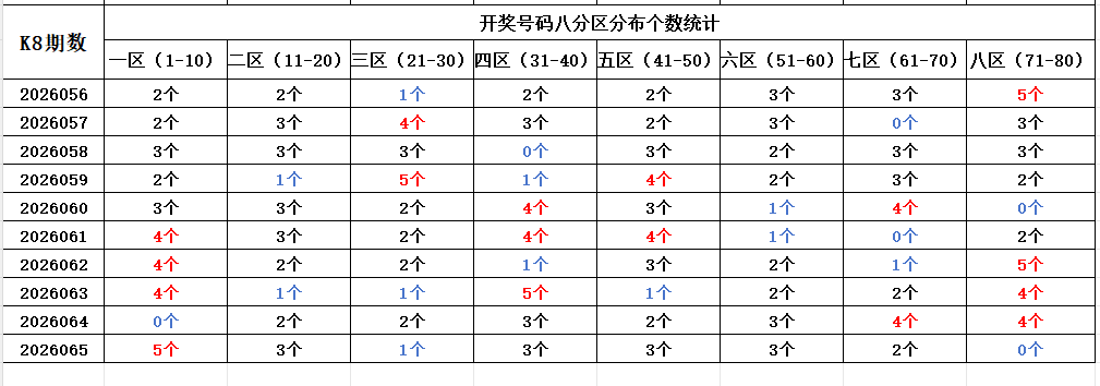 首先看上期回顾,“快乐8”第26065期开奖结果:1.2.4.7.9.11.14.16.24.32.34.37.48.49.50.52.53.59.63.70;通过分析开奖号码,分享第一个数据分析:统计开奖号码的八分区冷热走势,判断出号规律。以近10期开奖号码的八分区统计数据为例: