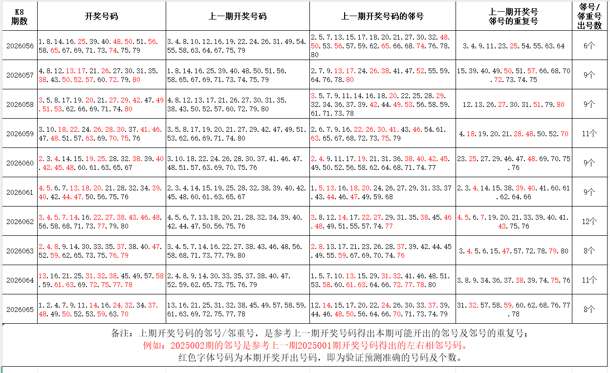 如图,上期的遗漏号码在下期开出10个左右,即为回补号码。定准点位区间首尾号码是关键!以上期2026065期为例,定位4个遗漏区间,围中17码!结合上期开奖号码,以跨度值大于或等于7为依据,本期关注5个遗漏区间:16-24/24-32/37-48/63-70/70-80;重点关注遗漏区间:3-15/23-36/44-58/64-80。点位区间号码和大底号码请勿混淆,个人分析,仅供参考。