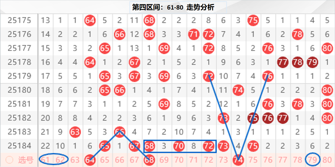 四区分析:【61-80】(走势图标注号码非小黄车大底,请谨慎参考,具体思路将在直播间分享讨论)