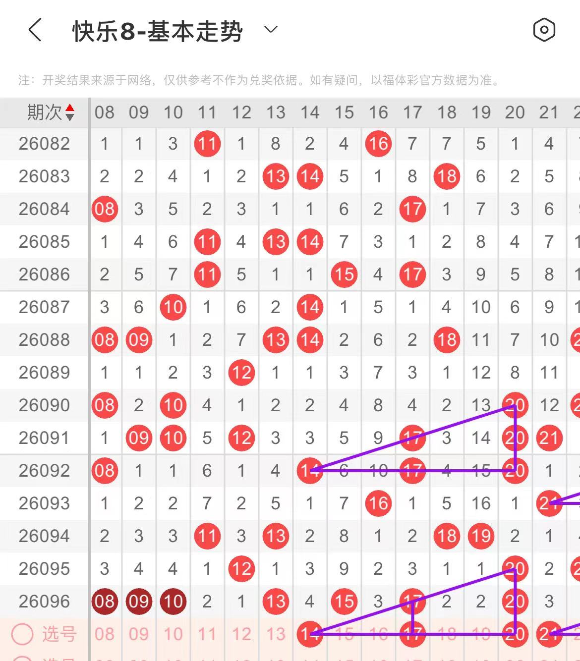 11-20区:本区间上期开出了四个号码,从号码走势图上看,该区出号个数有一定的规律性,本期防范出号个数减少的可能,本期有出号个数走势的号码有14.17.20号,复制上面走势形态出号,如果出号个数减少,那么14.17.20只有一个号码开出。