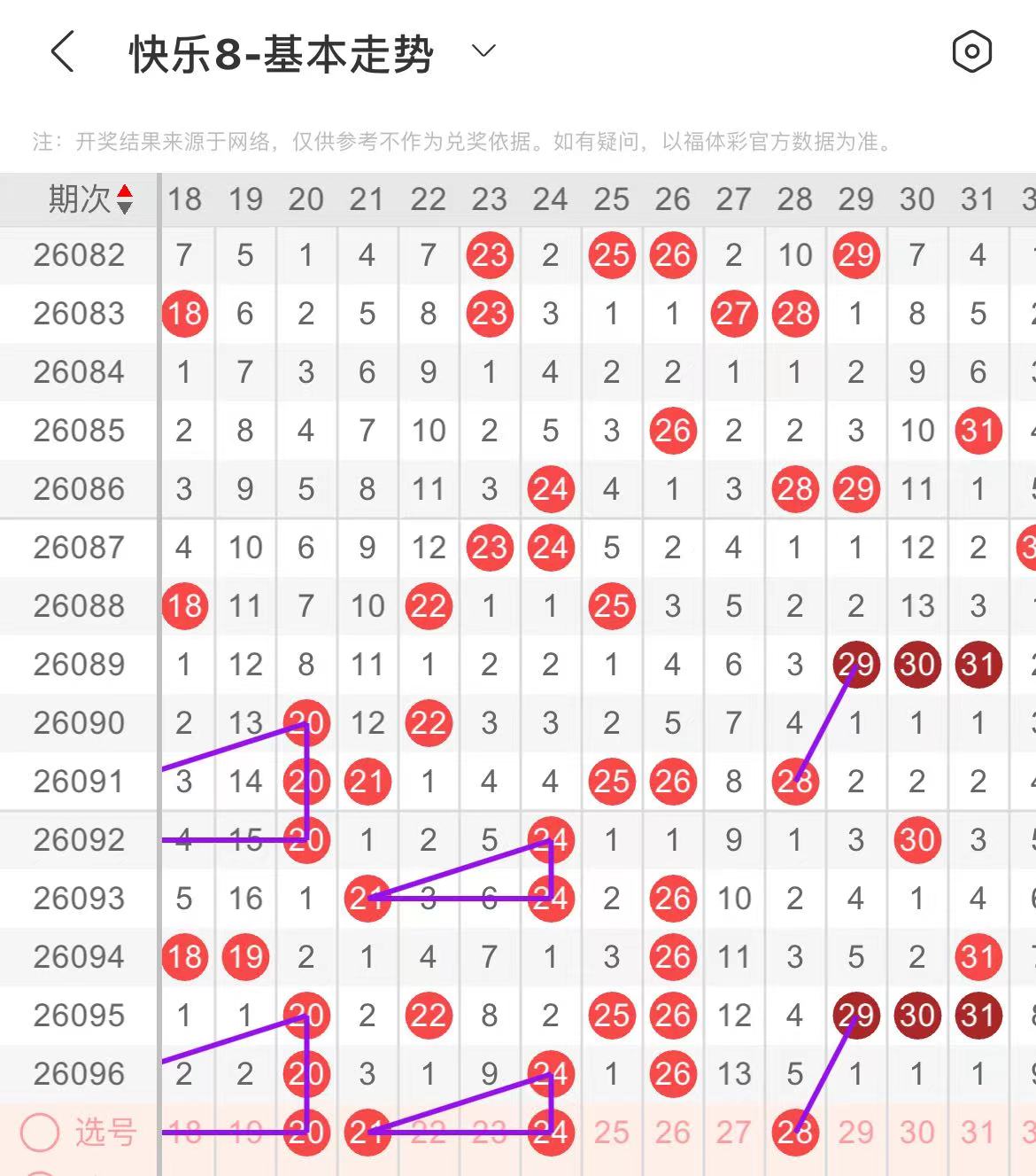 21-30区:本区间上期开出了两个号码,从号码走势图上看,该区现属于热号区,本期出号个数应该在三个号码或者以上,在选号上可考虑多做选择,有出号走势的号码有21.24号,复制上面走势形态出号,28号,29对应28出号走势。