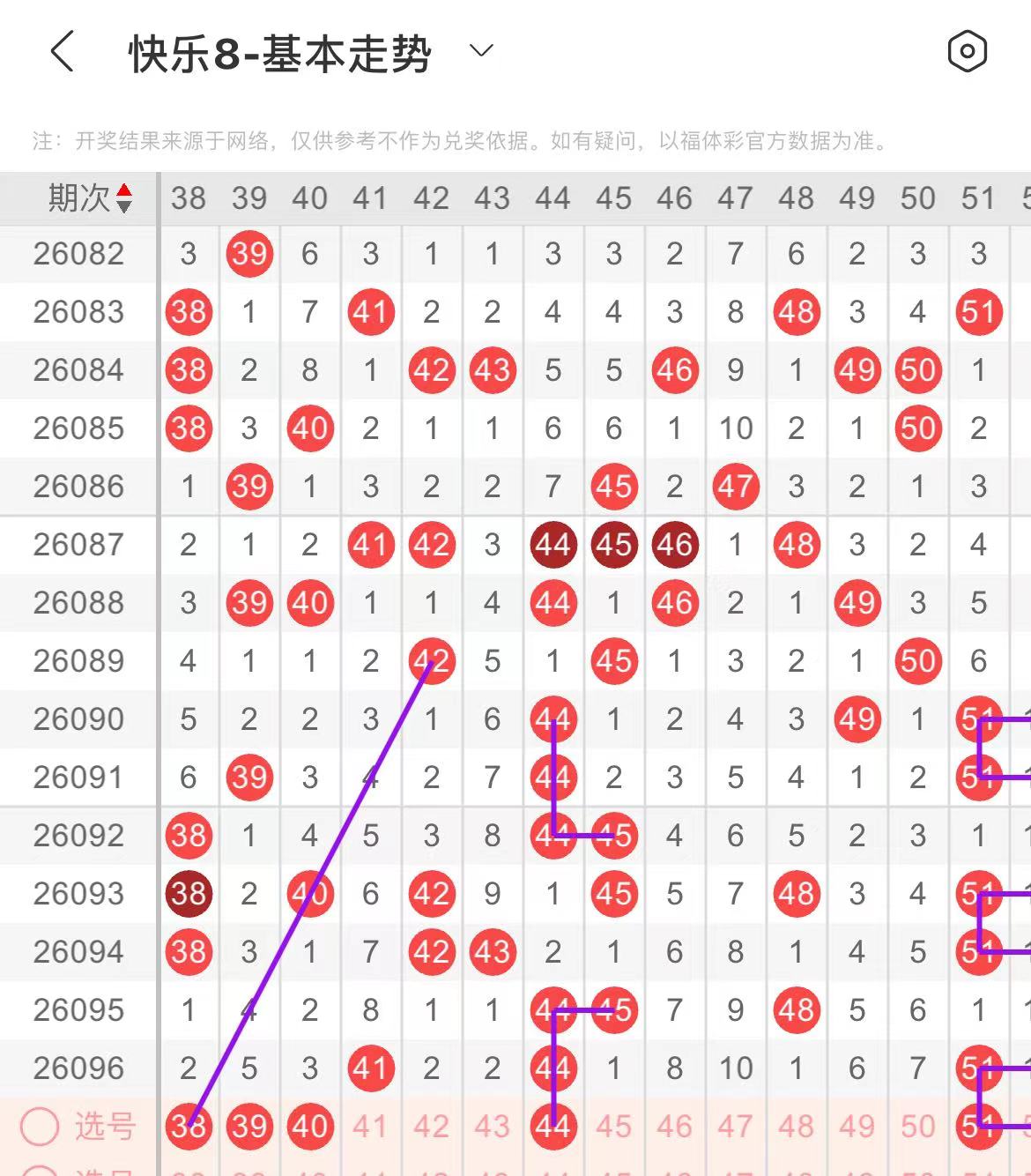 41-50区:本区间上期开出了两个号码,从号码走势图上看,本期可参考的号码走势甚少,而且该区现属于温冷区,出号个数在一两个号码之间,有出号走势的号码有44号,走三重,复制上面走势形态出号。
