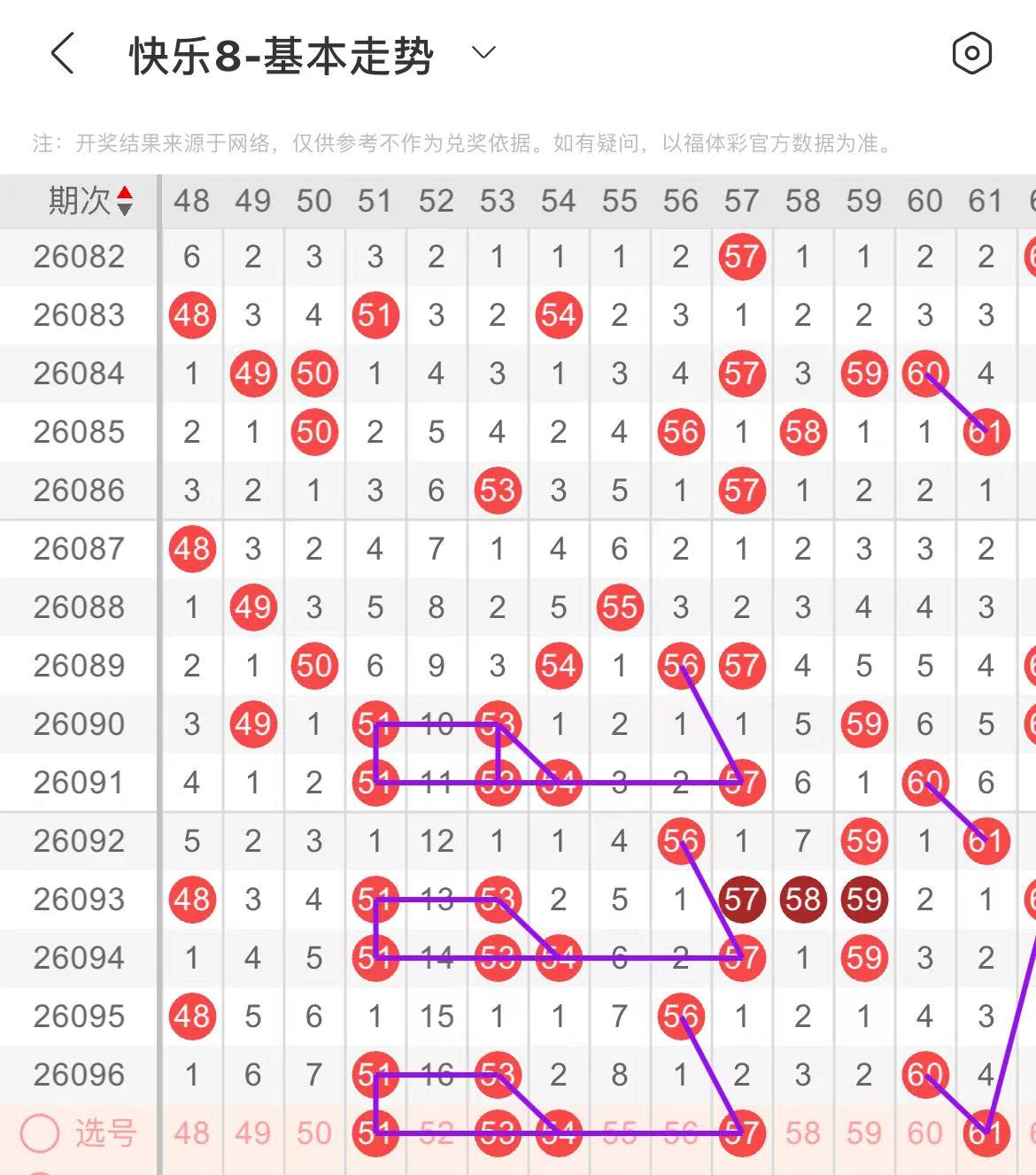 51-60区:本区间上期开出了三个号码,从号码走势图上看,本期号码走势比较强势,出号个数在三个号码或者以上,注意形态复制出号,有出号走势的号码有51.53.54.57直接复制上面走势形态出号。