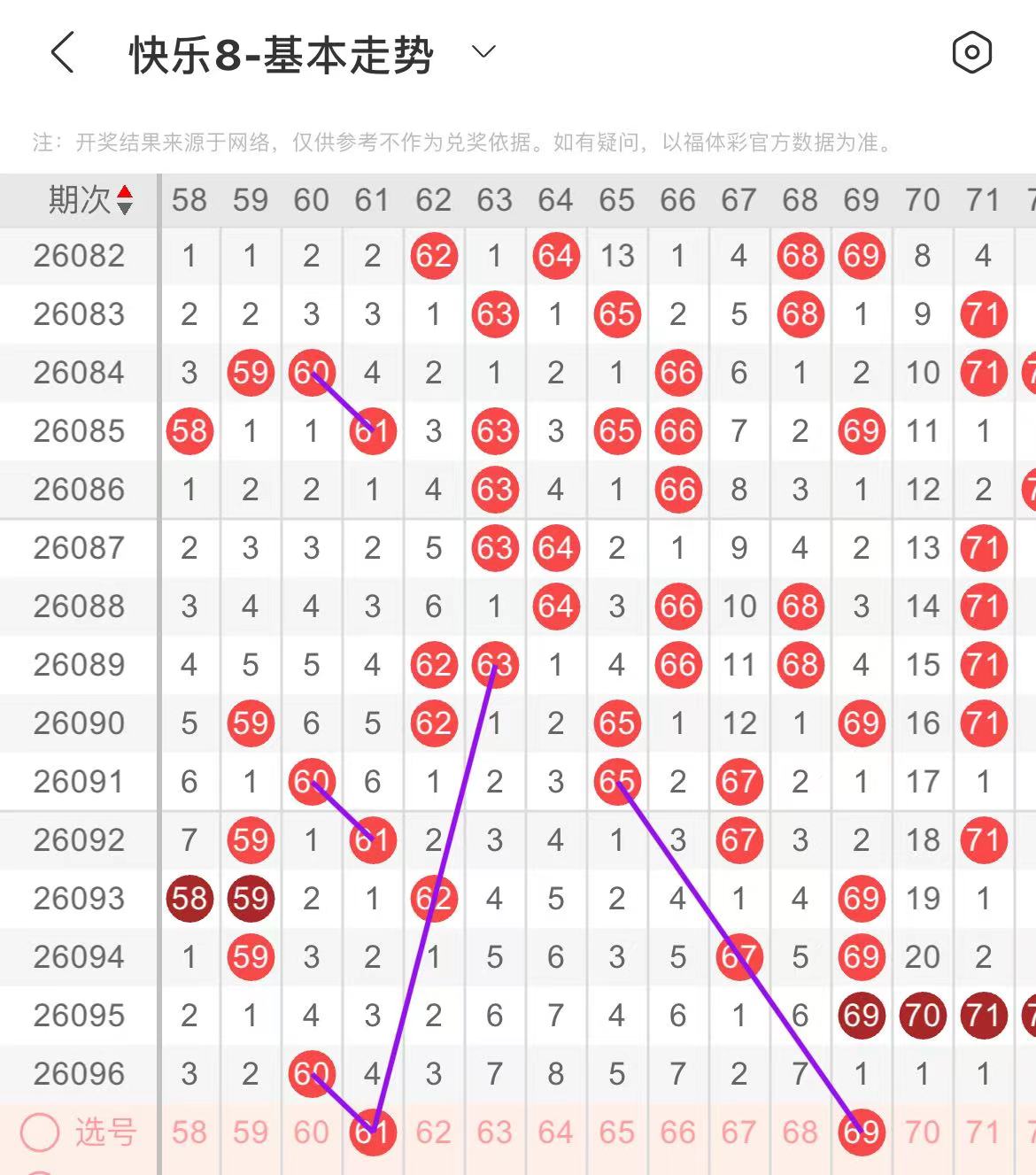 61-70区:本区间上期断区了,从号码走势图上看,该区连续断区的可能性不是很大,注意号码回补,不过回补的号码应该不是很多,重点关注区头区尾号码回补,出号个数在两个号码左右,有出号走势的号码有61.69号,均有斜连出号走势。