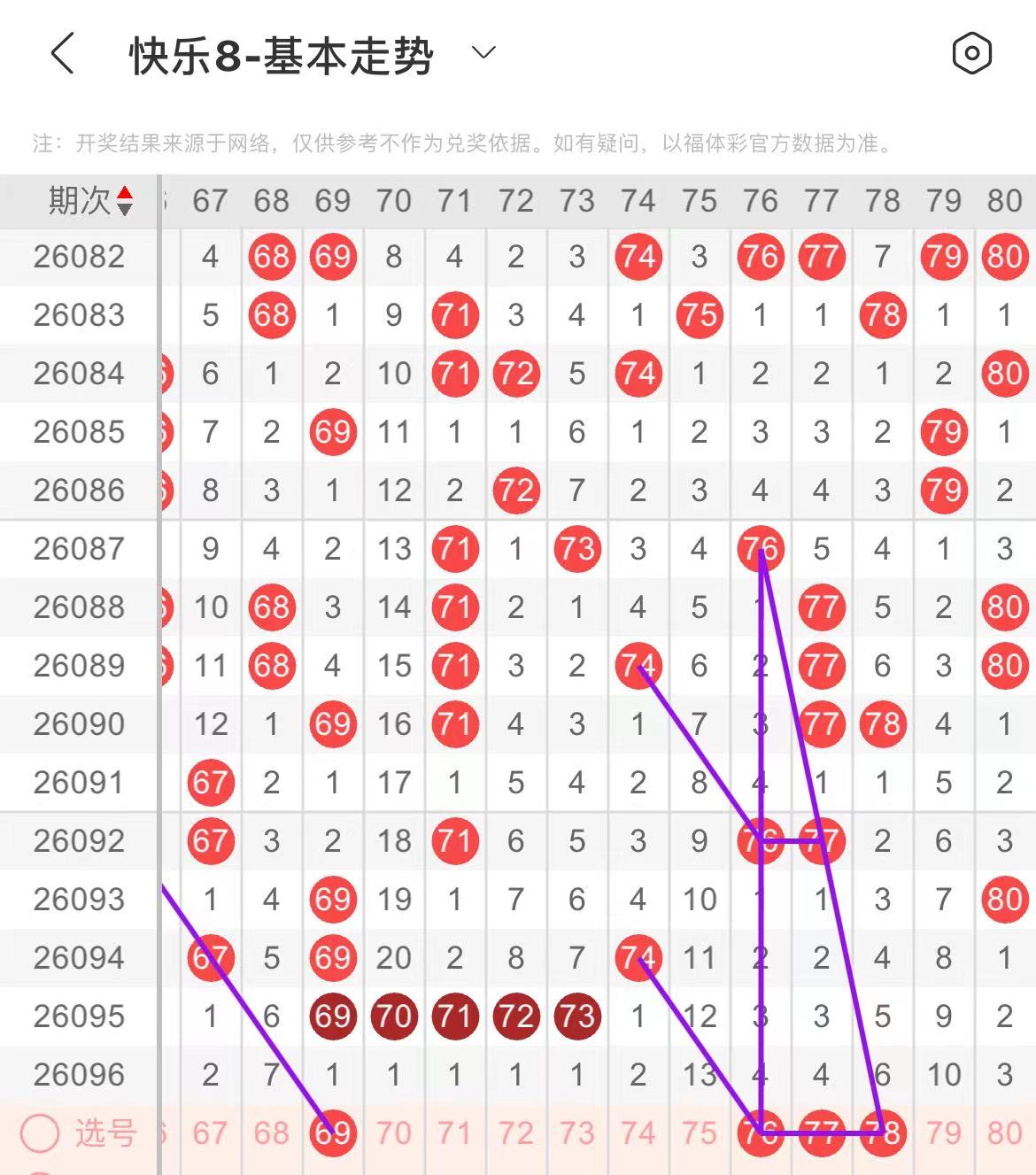 71-80区:本区间上期断区了,从号码走势图上看,本期注意号码回补,出号个数在三个号码左右,有出号走势的号码有76.77.78号,形成一个大三角出号走势。