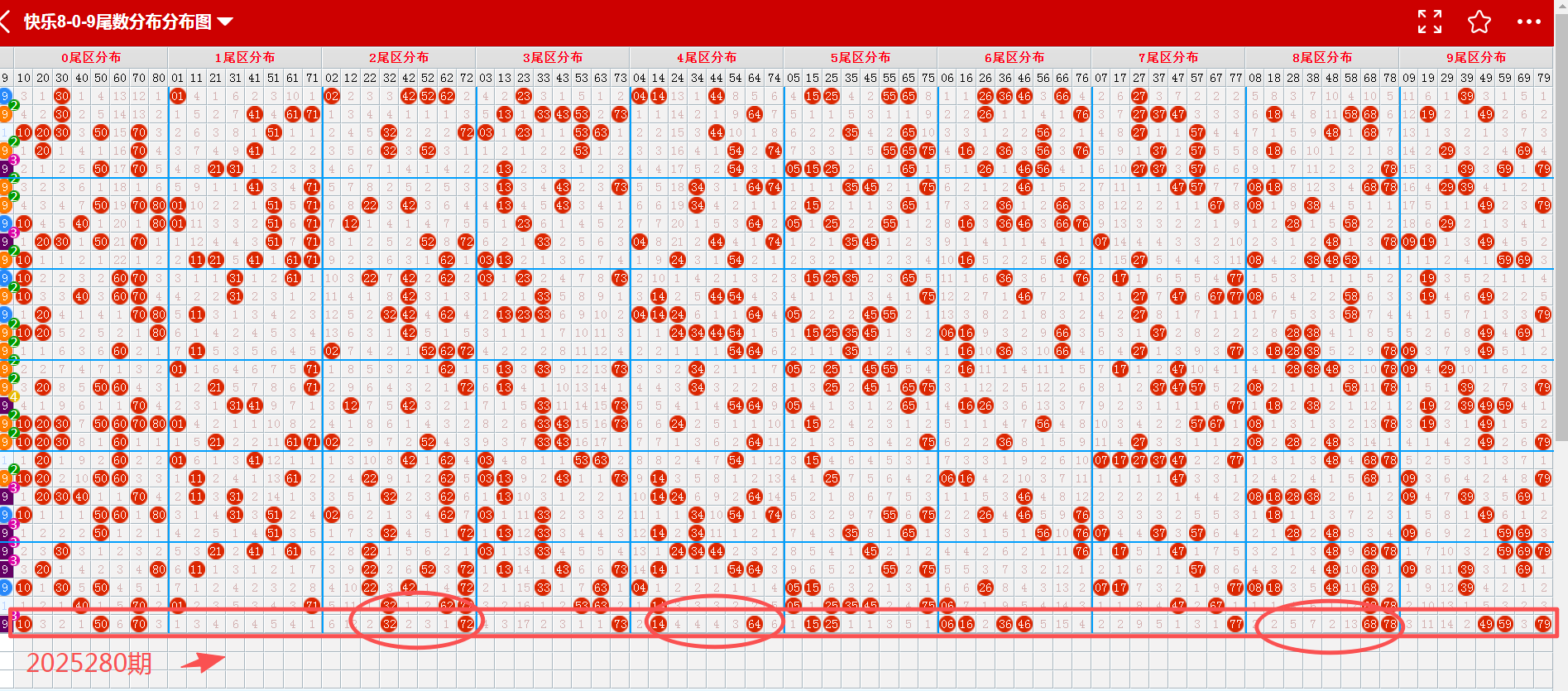 上图是快乐八2025280期的尾码走势图,从图中看0尾到9尾出号个数依次是:0尾号码区开出3个;1尾号码区开出0个;2尾号码区开出2个;3尾号码区开出1个;4尾号码区开出2个;5尾号码区开出2个;6尾号码区开出4个;7尾号码区开出1个;8尾号码区开出2个;9尾号码区开出3个;再看小尾号码(0尾-4尾)区有8码,大尾号码(5尾-9尾)有12码;数据比对统计后可以看到本期6尾出号数量最多,一共开出了4个中奖号码。本期1尾出现断区!由走势比对推断2025281期重点需要关注2、4、8尾区号码下号热度回补和落号数量增加的概率较大。