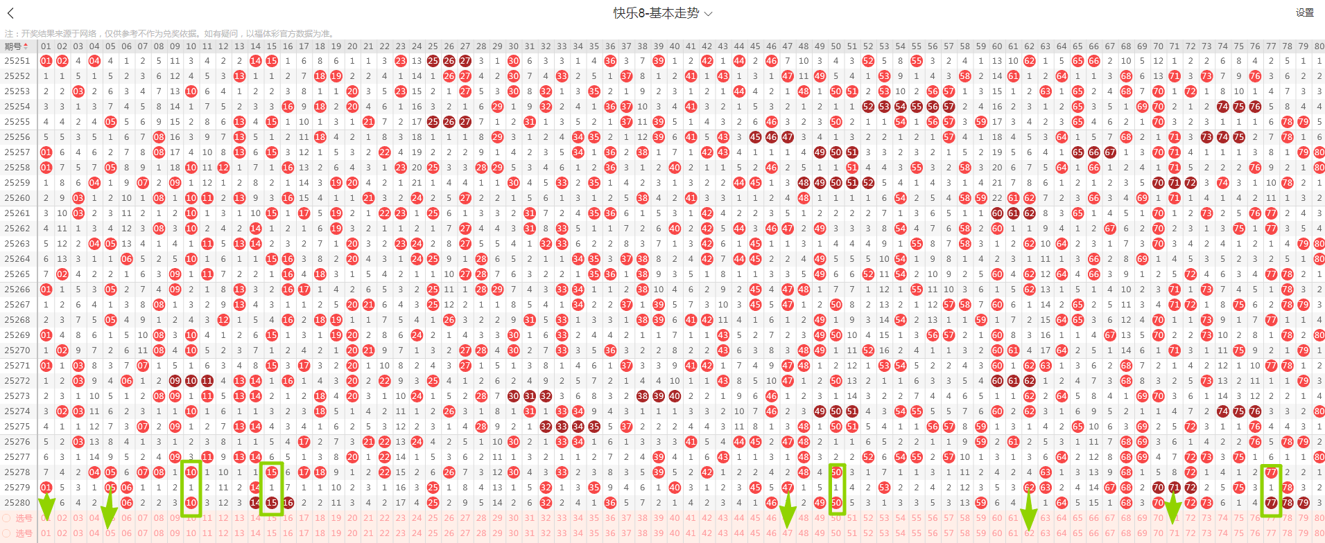 从这张走势图可以看到我画标出来了遗漏示意号码,开出了隔期(遗漏一期的)4个号码(绿色方块标示的),数量与上期大幅增加,从近期走势图看隔期码回温态势形成,本期判断热度反弹,落号5个号码概率较大(绿色箭头标示的01、05、47、62、71)需要关注,有下号概率;