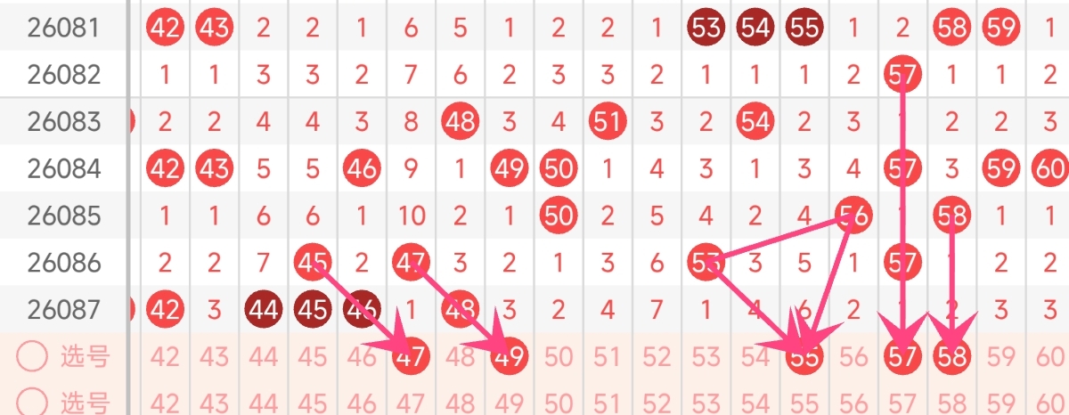 上期三区一口气开出6枚号码,是四个区间中最热的区域,出号的密集程度已经达到近期高点,因此本期必然会进入热量释放阶段,预计出号回落至4-5枚的合理区间。更值得注意的是,上期三区出号全部集中在41-48的下半段,51-60的下半段集体空开,这种极端偏斜的走势很难连续出现,本期下半段回补的可能性极高,选号时可以多在下半段做文章。而且还需注意其他已经连续多期漏出的号码,本期有几率回补。综合考虑,本期三区推荐关注号码:47、49、55、57、58。