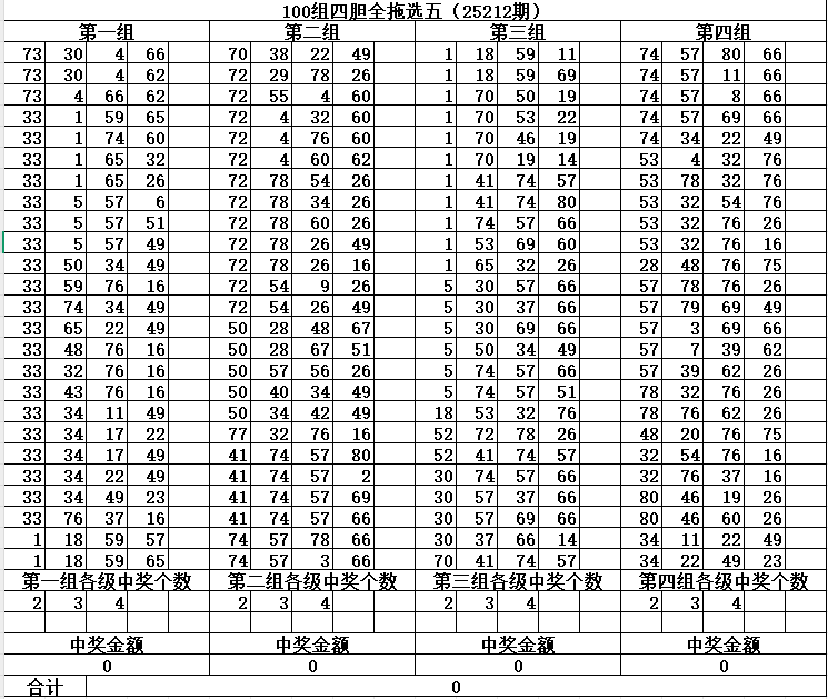 现在统计了近500期数据,组合出来100组四胆全拖进行测试一个月(8月)(每期都是根据我的公式得出的号码,理论100组平均每期出2-3组,因为理论是最好的情况,所以现在测试一个月看看平均每期可以出多少组四胆),100组四胆全拖金额为15200,中一组四胆奖金可以到17260(还有不少两胆(54)和三胆(534))。所以还是比较好的计划,缺点就是成本太高,所以现阶段还是测试,大家挑几注参考就好了,每期都会更新最新的100组四胆全拖。