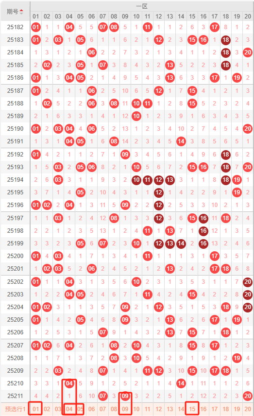 一区:最近一区10期出号情况为:4 5 6 6 4 7 3 7 2 3,总出号情况为46个,平均出号4.6个,本期推荐一区号码回补推荐出号为:01 04 05 09 15。重点关注:01 04 05 09。