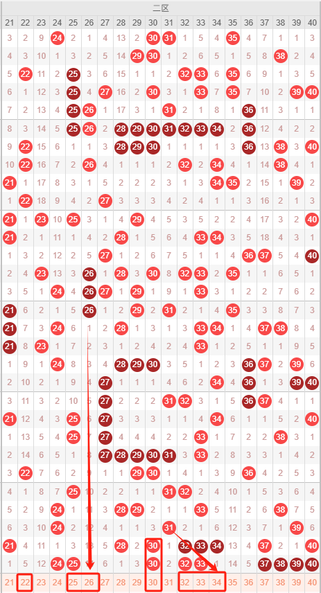 二区:最近二区10期出号情况为:5 5 4 6 4 3 5 3 8 9,总出号情况为53个,平均出号5.3个,本期二区号码还是比较弱势推荐:22 25 26 30 32 33 34。重点关注:22 26 33 34。