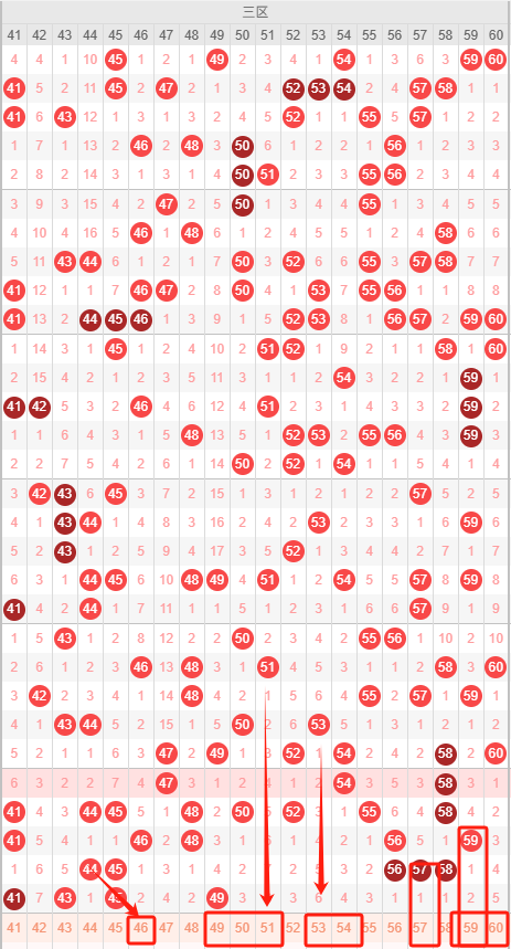 三区:最近三区10期出号情况为:4 5 5 4 6 3 8 5 5 4,总出号情况为48个,平均出号4.8个,本期三区号码走势比较不错推荐:46 49 50 51 53 54 57 59 60,重点关注:49 51 53 57 59。