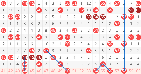 昨天三区间开出了【44.46.49.55】4个号码球,三区间温态四码落位,我们通过对三区间整体的走势可以看出三区间号码在区间走出震荡后形成的号码落位,通过分析老看三区间会继续出现 走势分化的可能,因此我们通过逆向思维逻辑分析得出的结论,我们这边考虑重码跟分边落号,44.46昨天重码落号,考虑44.46这两码一码走3重,个人看好44,防46,。50我们考虑斜4连的落号,看54的落号防56,本期预测这个区间出号在3-4码