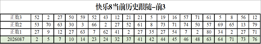 我感觉选热的同时,还要注意防冷条件开出,可以直接选取每个号码跟随出次前三的号码,也可以考虑把出次最后的三个数字加进去,不过这样可能号码太多,可以尝试。图上也能看出单独号码跟随的情况,我就不一一统计每个号码的出次了,我这里考虑提高概率,取每个号码历史跟随的前三号码和后三号码,根据2026087期的号码,我关注正数3和倒数3的号码号码为:
