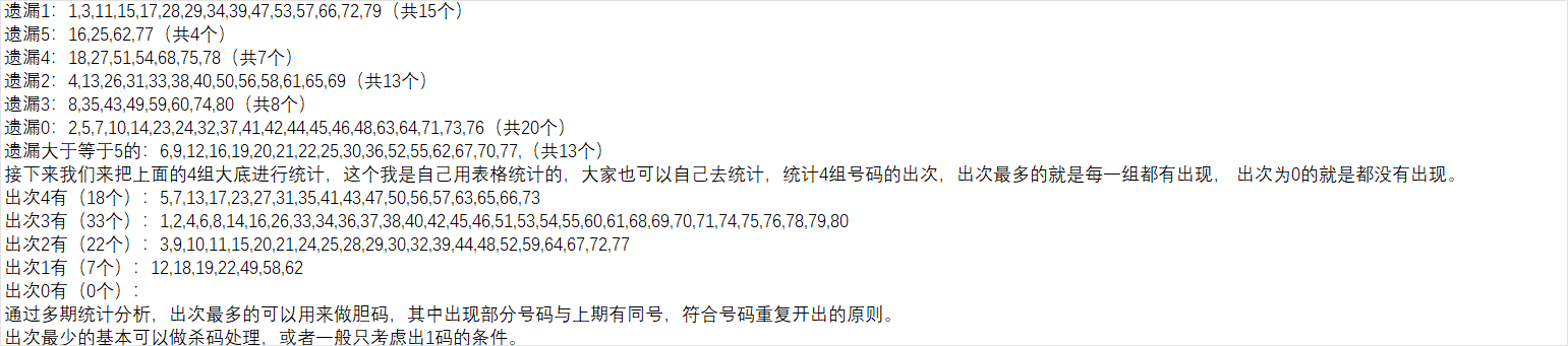 我的基本思路是通过号码尾数情况,取出6尾相关的号码作为第一组大底,然后统计号码跟随的情况分析出第二组大底,通过短期遗漏分析形成第三组大底,再按照对数补数分析统计出第四组大底(根据情况可能实时增加其他大底 ),最后把这些大底进行统计,重点关注出次最多的号码,搭配出次少的号码,灵活组号,形成本期精选胆码。