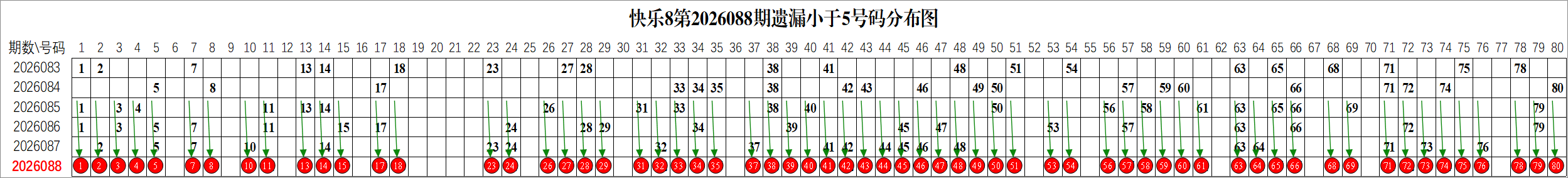 所以这个条件值得关注,从号码分布图上我们可以分析出,遗漏小于5期的号码有:
