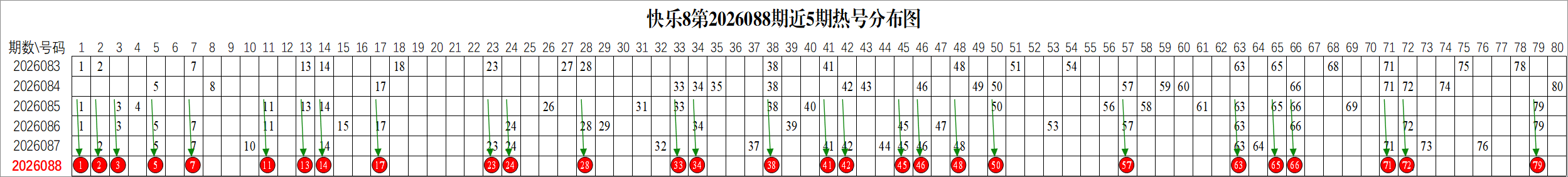 这个条件可以理解为追热号,主要是选取遗漏小于5期的号码来做大底,通过号码分布图我们也能看出,每期都有重复号,都有上期号码的相邻号,再仔细观察下面的部分分布图,2026087期,按照【号码(遗漏)】的方式统计出来是:2(3),5(0),7(0),10(7),14(1),23(3),24(0),........。可以看出遗漏小于5的号码比较常见,这就是一个大概率事件,我们就可以用这个梳理出一部分号码,用来作为我们交集的一组号码。