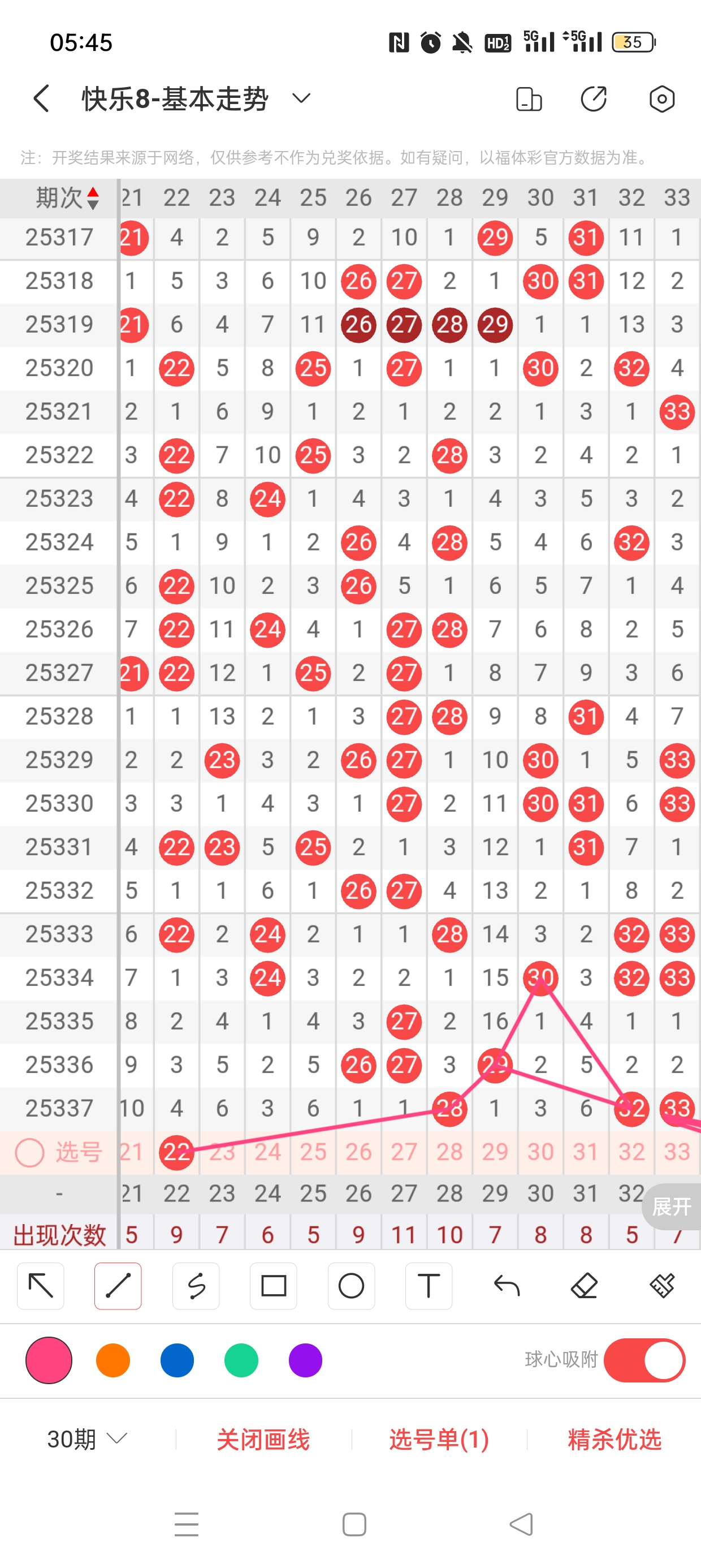 奇偶比10:10,和值823,区间比6:3:6:5,同尾比值2:2:4:3,重号:6、10,连号:32、33。总结完毕,下面开始本期分析。