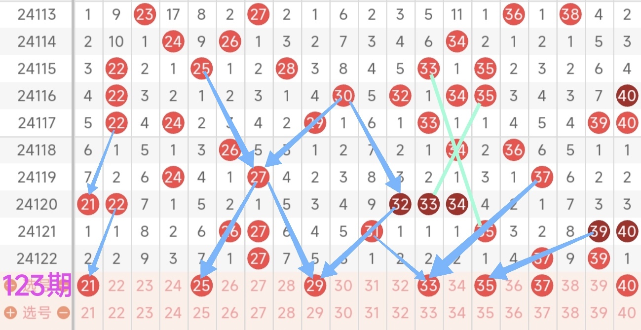 上期2区走冷,开出3个号码,本期可能会走向温热,两个遗漏值2的21和22可能下一个,22可能走上下遗漏2期的对称走势,23遗漏9期,有走冷的风险。遗漏7期的25可以带着24一起做,25是27和26的隔期1斜连号,29,从25和27下来的隔空3期的一个斜连,今天29的走势较好。后半区(31~40)的37今天有走重的可能。33,37和35的隔空一期号码。31是35、34、33、32的隔期2的5斜连号。35,39和37的隔空斜连号码。防守号码32、34、40。