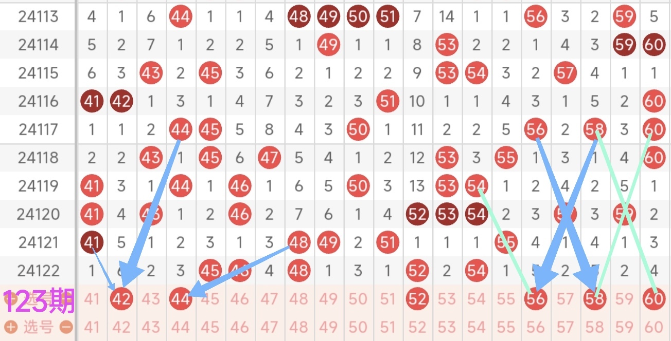3区今天重点关注42,44和43的隔期2斜连。48和45的隔空2斜连号。两连号走势45、46的边号44,48和46的隔空斜连号,可做为防守号码。两连号45、46可能有一码重,如果从尾号出号情况来看,45和46都有可能走重。52本期可以防重号。隔期1斜连号的56、隔期2斜连号的56、58、60。从3区后半区走冷的情况分析,只能说56走势更好一点。