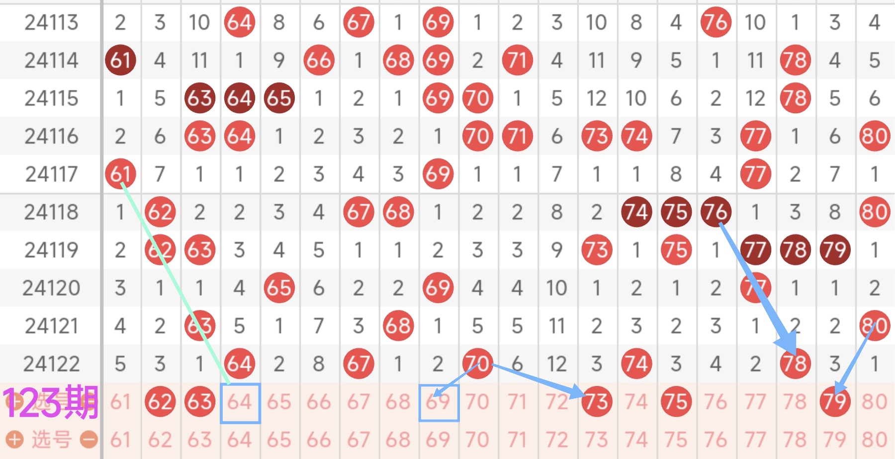 上期4区间温热,开出5个号码,一个孤号74。64是61、62、63、的4斜连号,走重的概率较小。他的边号,63和65可以关注一下,63走势更好。三斜连号69、68、67、开出,又开了70,可能会有一个与69、68、67的平行的走势,那69可以做为防守号码。孤号74的边号73、75做为防守号码,73的走势较好,76有一个80、78、76的隔空斜连走势。76和79看一个。