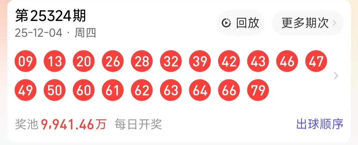 12月4日324期开奖号新鲜出炉:09、13、20、26、28、32、39、42、43、46、47、49、50、60、61、62、63、64、66、79,这组号的规律,彩友扫一眼就门儿清,还是连号扎堆、低区偏冷、高区火力全开的特点,老罗上期分析总体的思路依然没有问题: