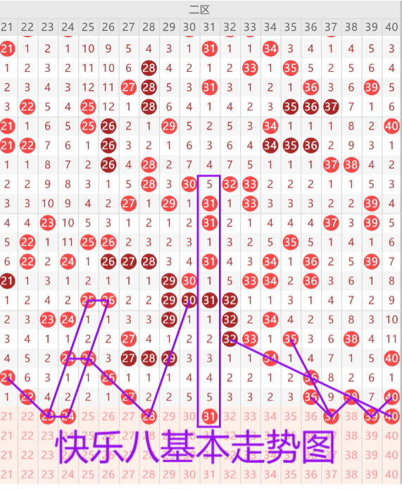 我们先来看下二区的基本走势情况,上期开出了五枚开奖号码,本期预计开出4-5枚开奖号码,首先我们来看23 24的楼梯形态建议防守为主,28的四斜连带双线斜连走势形态,31的空一空五30期遗漏形态重点。37 39双夹号二选一。选择哪个则考虑左右带偶数做二连形态。