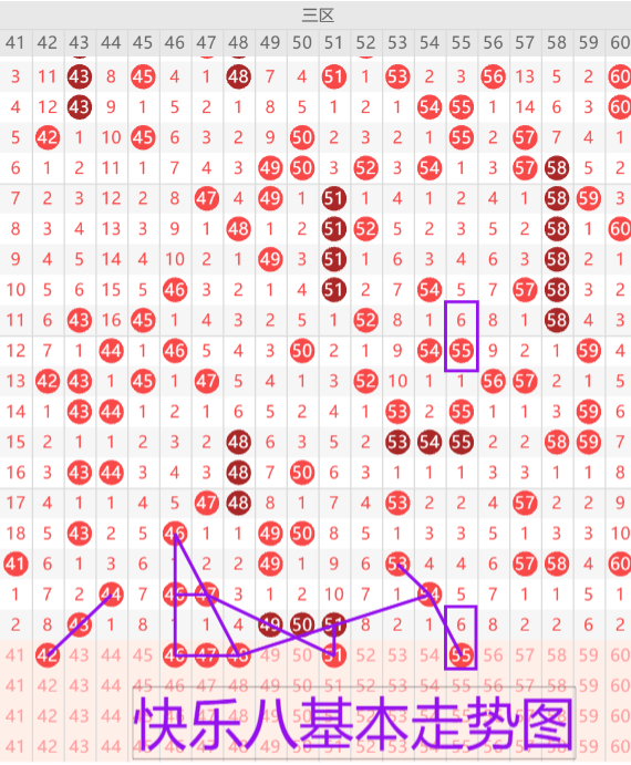 我们来看下三区的基本走势情况,上期开出了四枚开奖号码,本期预计开出4-5枚开奖号码,首先我们来看42的三斜连走势形态,46 47 48的三角形走势可以考虑三选一或者三选二。49 50 51下方考虑重号一枚。65的遗漏六期对称形态。