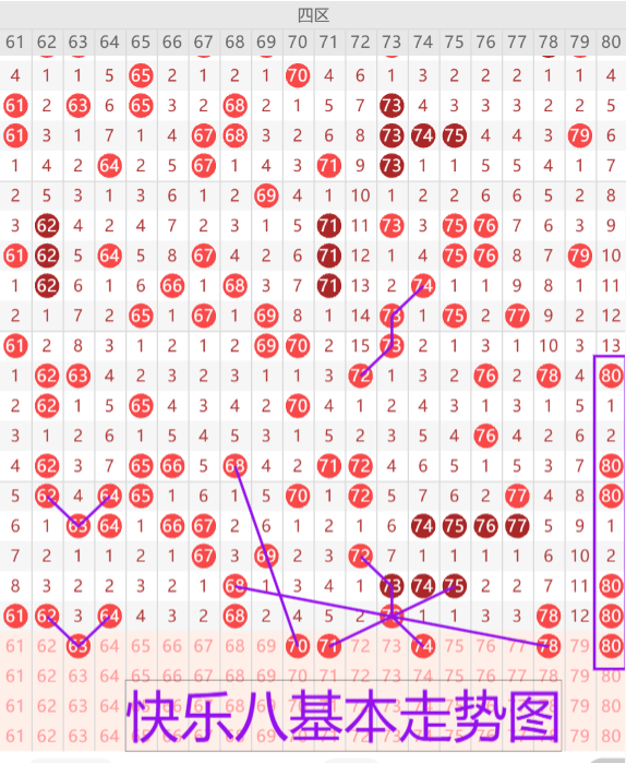 我们来看下四区的基本走势情况,上期开出了七枚开奖号码,本期预计开出4-5枚开奖号码,首先我们来看63号的夹号复制形态。70 71均为双边三斜连走势的二连形态 二选一或者同出。74的上下对称复制形态。78 80重号二选一。
