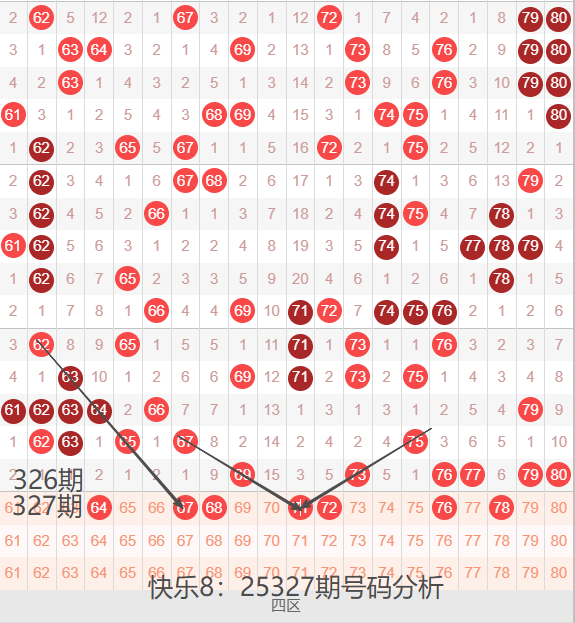 上期该区间开出号码:69 73 76 77 79 80,6个号码球,区间呈现热开,四区间整体来说太不稳定,该区间也是经常冷一下,热一下,前端和后端也是经常拉扯,双方经常交替落码,选号时,还是谨慎一些比较稳妥,本期个人四区间预选号码:64 67 68 71 72 76 78,64号是遗漏2期的号码,67号是遗漏1期的号码,68号是遗漏9期的号码,71号是遗漏3期的号码,双线斜连的夹角落位点,72号是遗漏5期的号码,76号本期看重码的机会,78号是遗漏6期的号码,通过以上分析,四区间终选号码:64 67 71 72 76 。