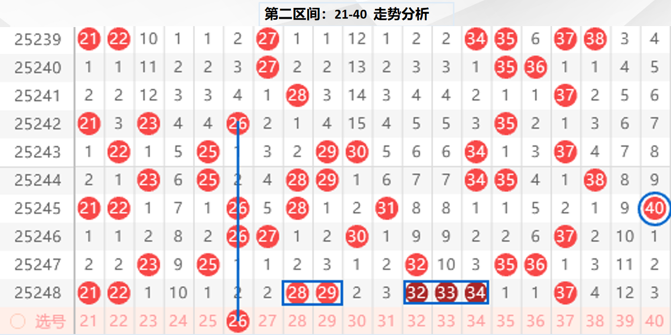 二区分析:【21-40】(走势图标注号码非小黄车大底,请谨慎参考,具体思路将在直播间分享讨论)